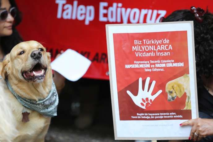 Lors d’une manifestation, à Ankara, pour la pénalisation de la zoophilie, en juin 2018, après la diffusion sur les réseaux sociaux d’une vidéo montrant le viol d’un chien. Photo : © Adem Altan/AFP