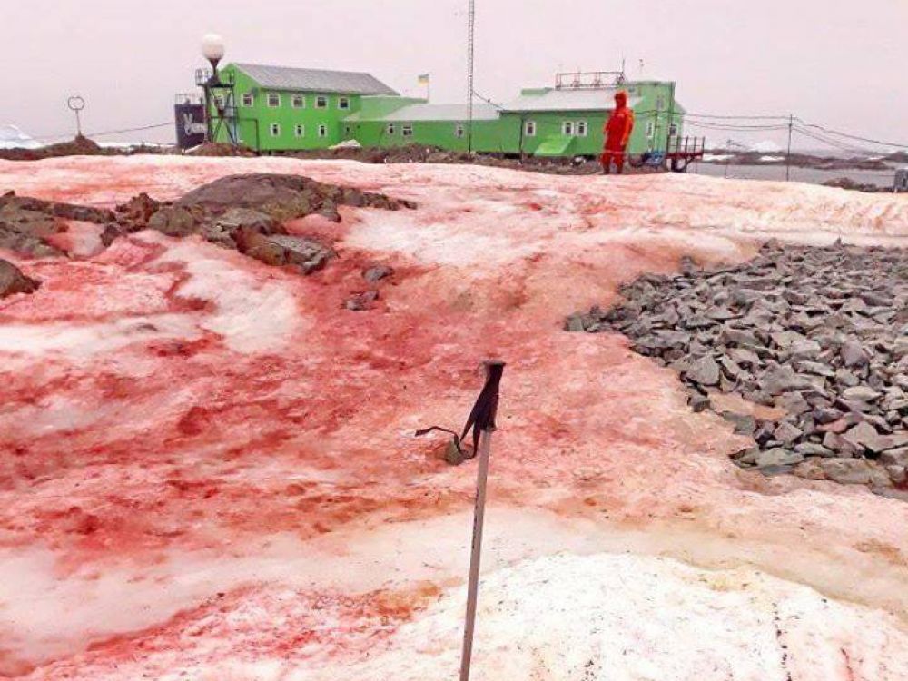 En Antarctique, certaines zones neigeuses se sont recouvertes d'une couleur pourpre. En voyant les photos ci-dessous diffusées le 24 février 2020 sur Facebook par le ministère de l'Éducation et des Sciences d'Ukraine, on ne peut que penser à du sang. Pourtant il n'en est rien : cette coloration n'est que le résultat d'algues microscopiques.