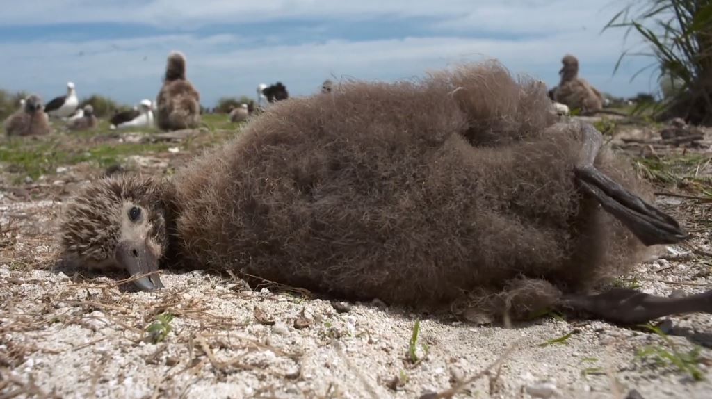 Les albatros adultes comme les poussins sont nombreux à y mourir d’inanition après avoir ingéré parfois plusieurs dizaines d’objets en plastique flottant au gré des vagues. Les adultes consomment ces objets souvent recouverts d’œufs ou d’organismes marins comestibles et les ramènent comme nourriture à leurs petits. Ces objets, non dissous par les sucs digestifs et ne pouvant sortir de l’estomac, entraînent rapidement l’agonie des oiseaux qui meurent par la négligence d’une civilisation située pourtant à plus de 2000 miles marins d’eux...