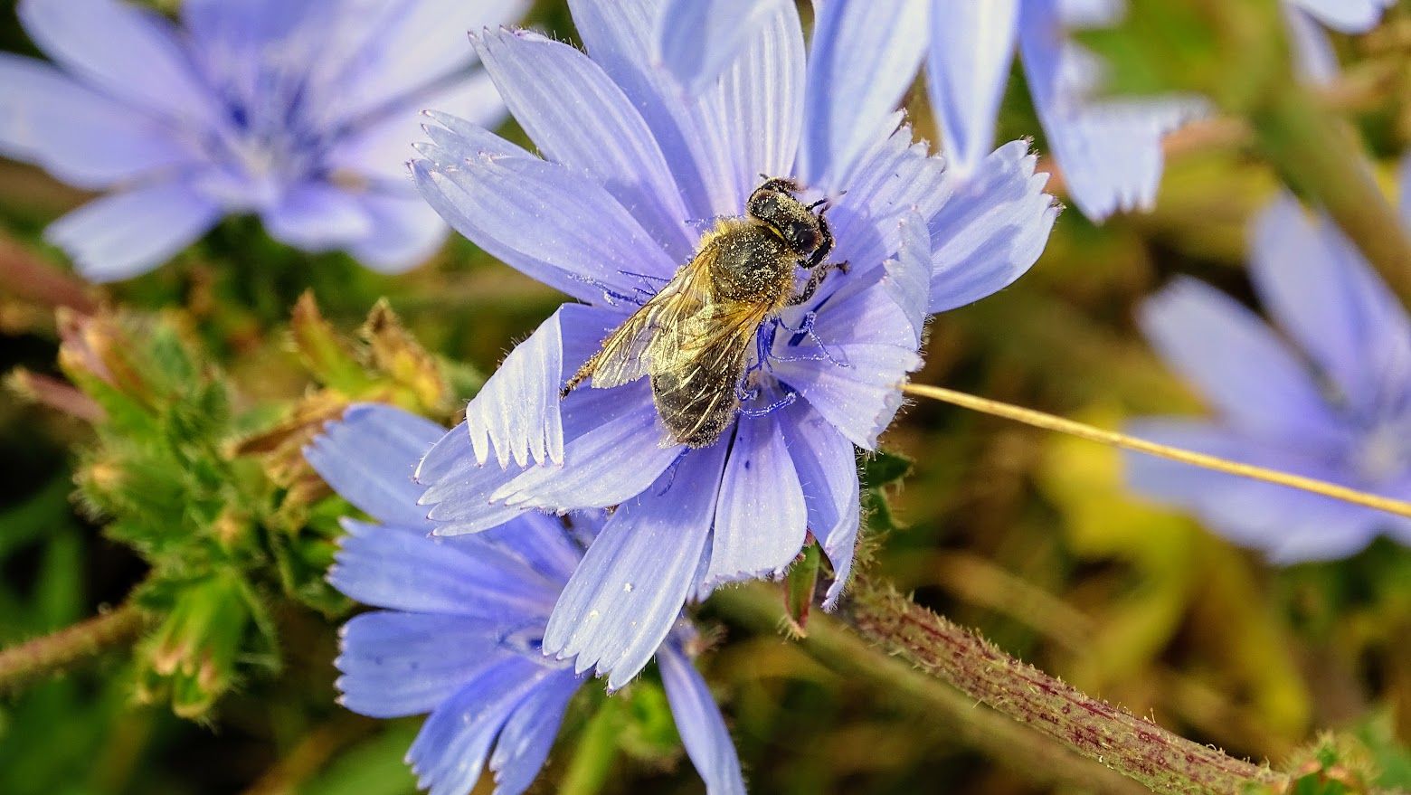 Chicorée ! Tout le monde connaît le mot même si, actuellement, on n’en consomme plus beaucoup : jadis, on faisait griller sa racine pour l’utiliser en remplacement du café ! Quoiqu’il en soit, on peut aussi parfaitement se contenter de l’admirer et, pour cela, il n’y a qu’à se baisser un peu : avec un peu de chance, vous verrez divers syrphes et d’autres insectes car, les fleurs sont très appréciées par l’ensemble des butineurs !